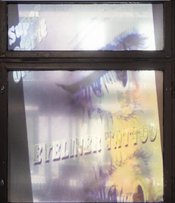 After filming LED video advertisements in a newly built shopping mall that is part of a gentrification program in Kosovo, six still images were selected from the footage. As static images, they appear indistinct and pixelated, with the LED lights forming checkered patterns. These images are printed on transparent vinyl and mounted in the large windows of the exhibition space. Blending seamlessly with the outdoor surroundings, they create a colorful room where shadows play on the walls and floor throughout the day, blending the inside and outside of the space into an illusion.