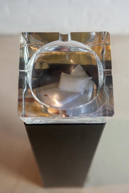 Beneath a thick glass ashtray lies a photograph of a hotel bed, its image warped by the glass reflections, making it hard to discern. The ashtray sits on a black pillar that matches its circumference. The title hints at a scene or a score, as if the image was a still from a film.