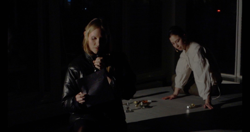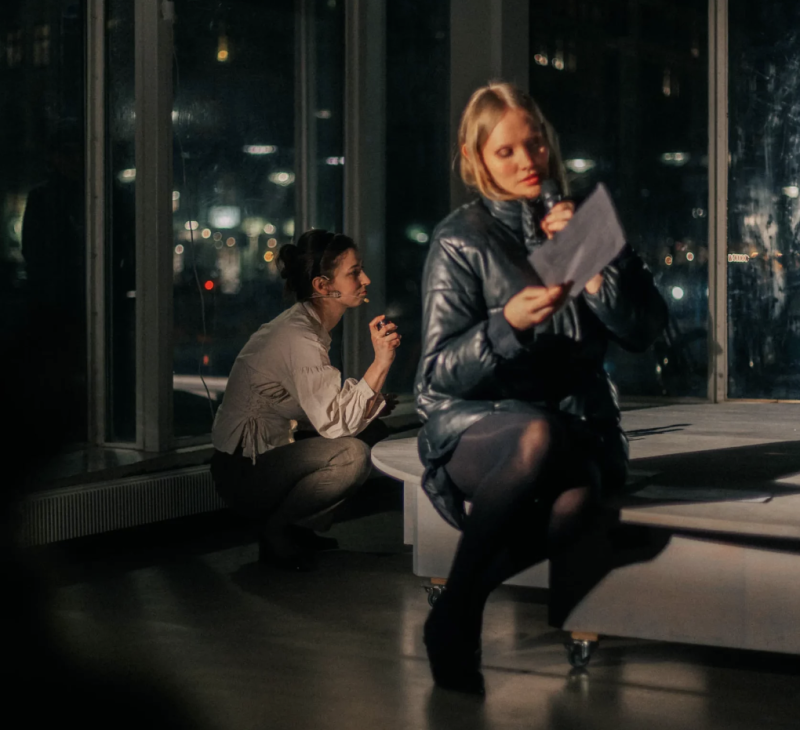 It delves into themes of obsession, erotic relationships, and stalking, depicting a young woman breaking into her lover’s house. One performer, serving as the narrator, sits on stage facing the audience, reading the score and story aloud. Meanwhile, the young woman stands outside, knocking on the window, her movements synchronized to the narration. She then breaks into the house (the exhibition space), and the story unfolds. The score explores themes of jealousy and power structures, blurring the lines between the inside and outside.